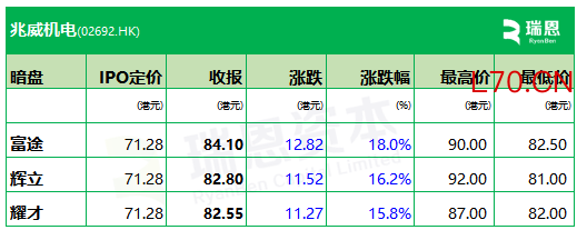 耀才交易平台显示,兆威机电暗盘最高价、最低价分别见87.00港元、82.00港元,收报82.55港元,较上市价高出15.8%或11.27港元。