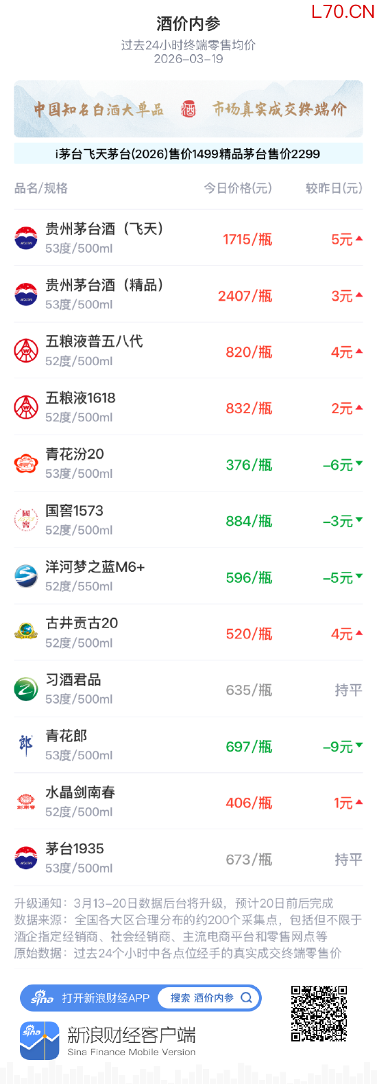 新浪财经“酒价内参”过去24小时收集的数据显示,中国白酒市场各大单品的终端零售均价在3月19日呈现窄幅波动态势。如果主要单品各取一瓶打包售卖,今日总售价为10561元,较昨日下跌4元。市场交投延续平稳状态,终端报价继续分化运行。