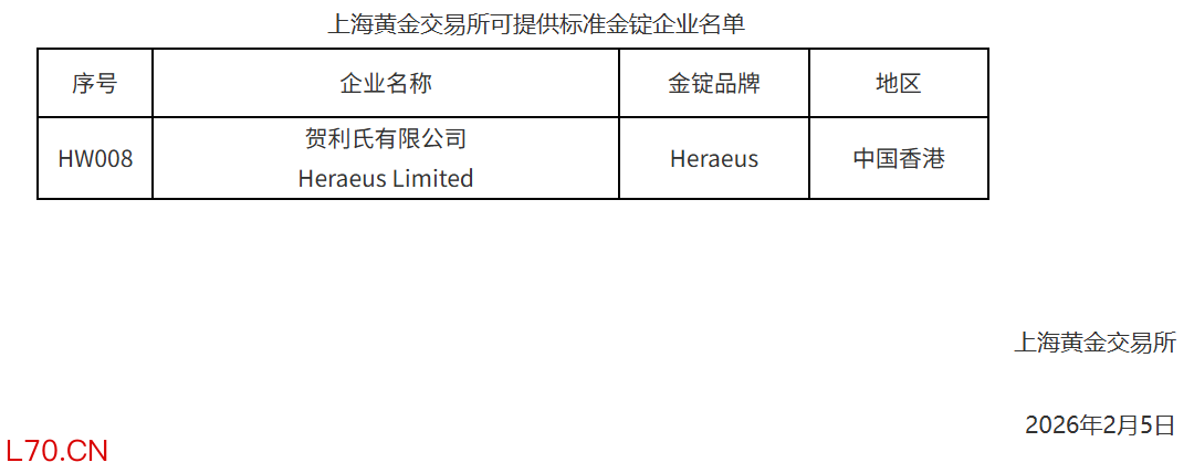 上海黄金交易所:新增贺利氏有限公司为境外可提供标准金锭企业