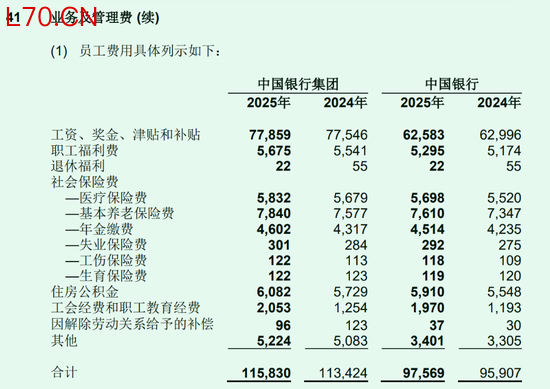 以“工资、奖金、津贴和补贴/员工人数”口径计算,中国银行2025年人均薪酬为24.82万元,与上年度的24.79万元基本持平。