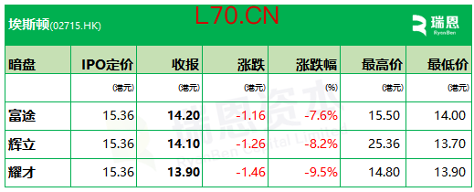 耀才交易平台显示,埃斯顿暗盘最高价、最低价分别见14.80港元、13.90港元,收报13.90港元,较上市价低出9.5%或1.46港元。