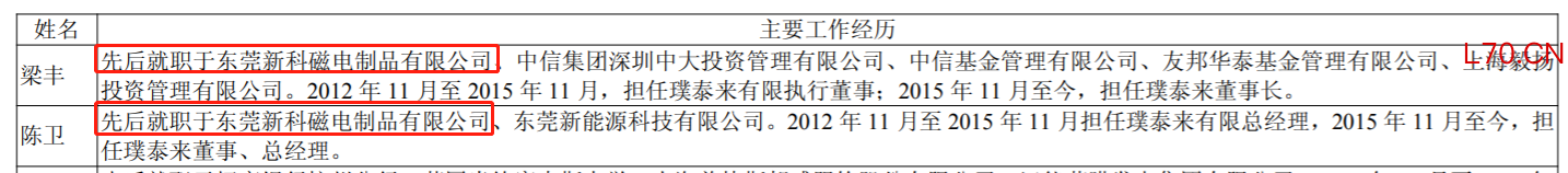 截至上市时,璞泰来董事会将由六名董事组成,包括三名执行董事及三名独立非执行董事。董事长梁丰和总经理陈卫曾是同事,都曾在东莞新科磁电制品有限公司供职。