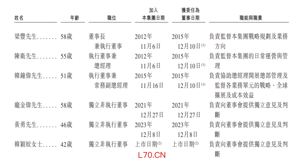 梁丰,58岁,于2003年3月自浙江大学获得经济学硕士学位,为公司董事长兼执行董事。他自2015年12月起一直担任董事长兼执行董事。其主要负责监督集团战略规划及业务方向。