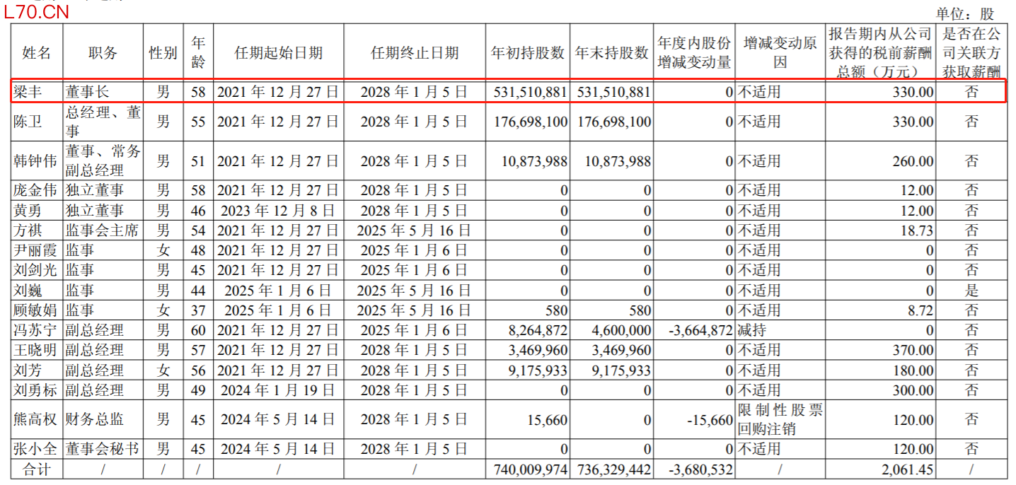 2024年、2025年,梁丰、陈卫薪酬均相同,去年两人自璞泰来获得的薪酬总额均为330万元,都较2024年的160万元同比增长了106.25%。