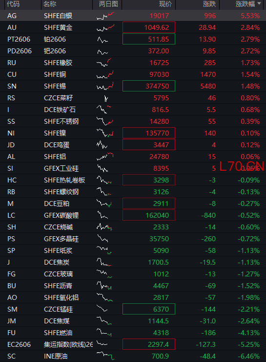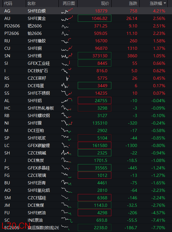 商品:国内商品期货普涨,截至发稿,沪银、沪金、钯金、铂金等涨幅居前,焦煤、焦炭、燃油、原油等纷纷下跌,集运指数跌超7%。