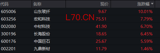 玻纤概念快速拉升,山东玻纤逼近涨停,国际复材涨超10%,中国巨石、中材科技跟涨。