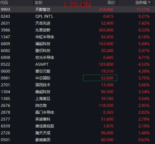 港股芯片股集体冲高,天数智芯大涨近12%,华虹半导体、壁仞科技涨近6%,中芯国际、上海复旦涨超3%。