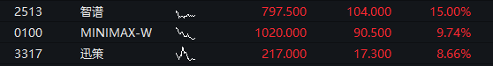港股AI应用股走强,智谱涨15%、MINIMAX-W涨9.74%、迅策涨8.66%。