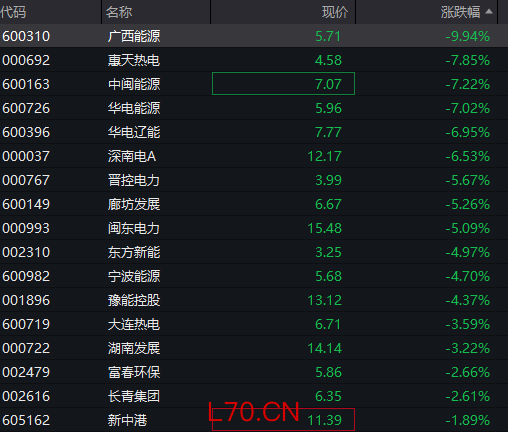 电力板块集体下挫,广西能源(维权)触及跌停,中闽能源、晋控电力、闽东电力、华电辽能均跌超5%,豫能控股、韶能股份、江苏新能跟跌。