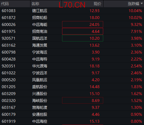 海运股拉升,锦江航运、招商轮船直线涨停,中远海能冲击涨停。